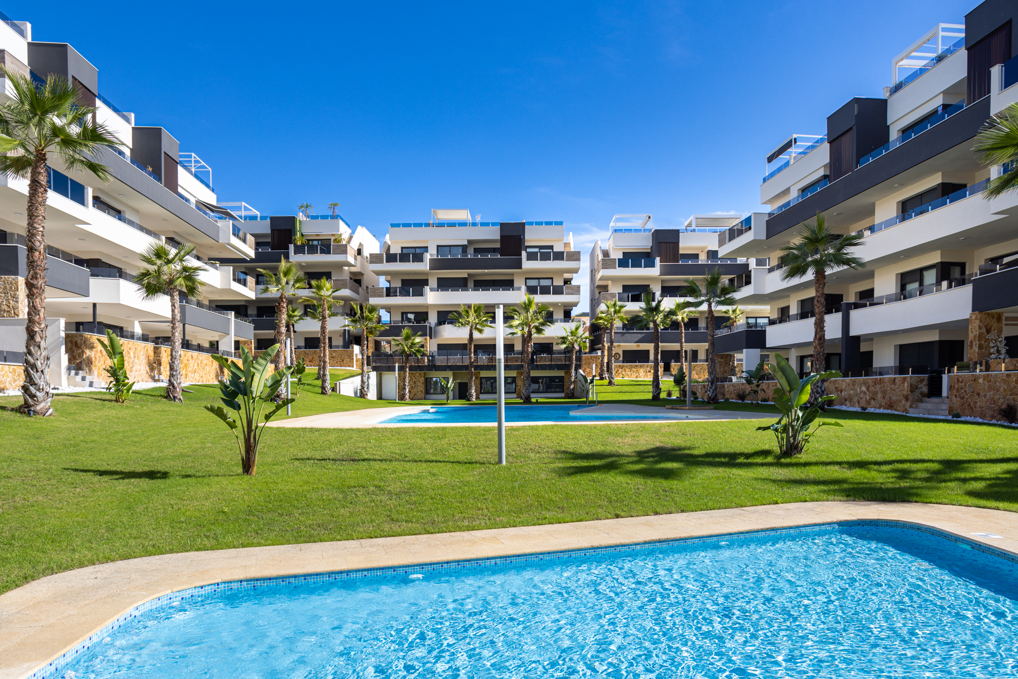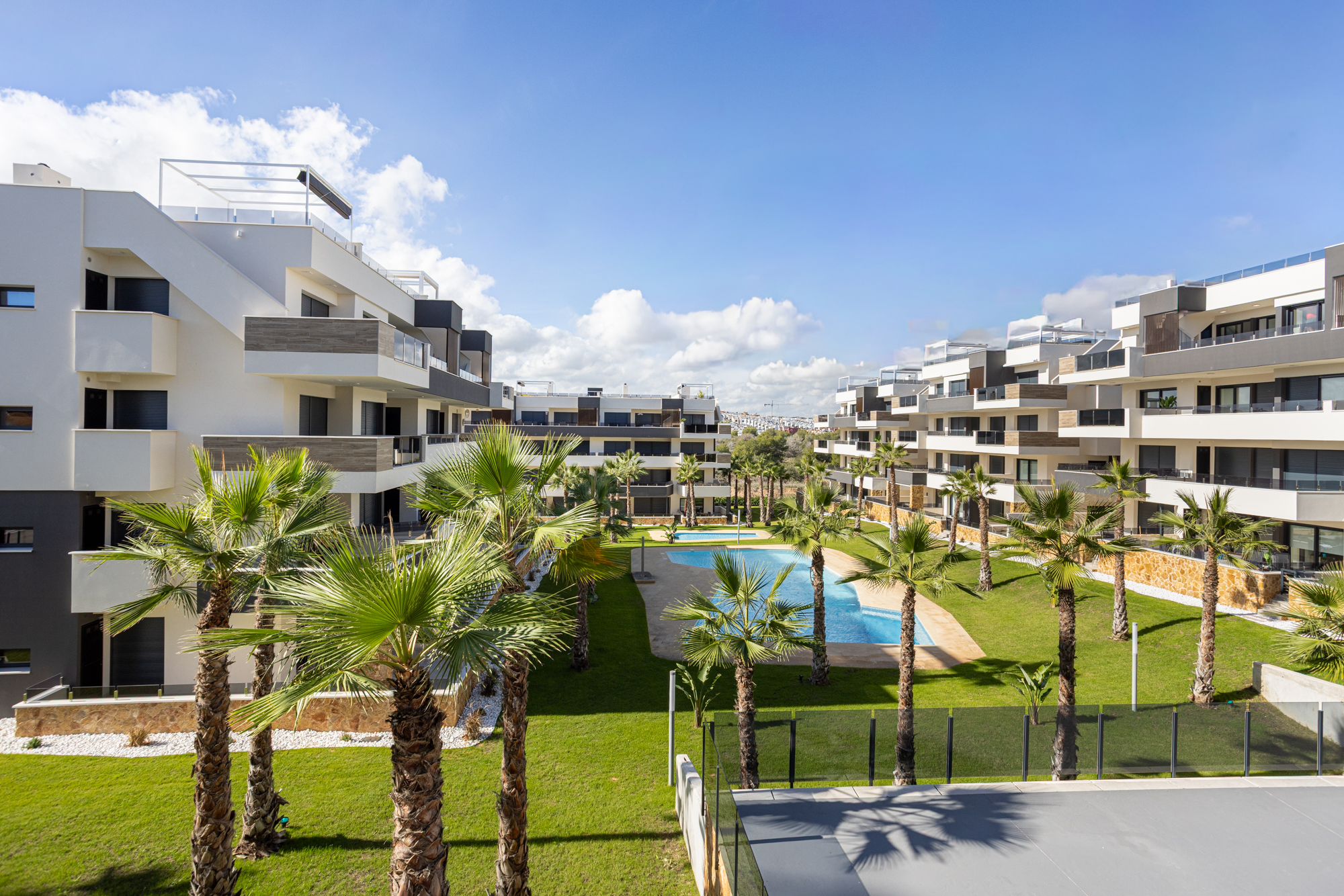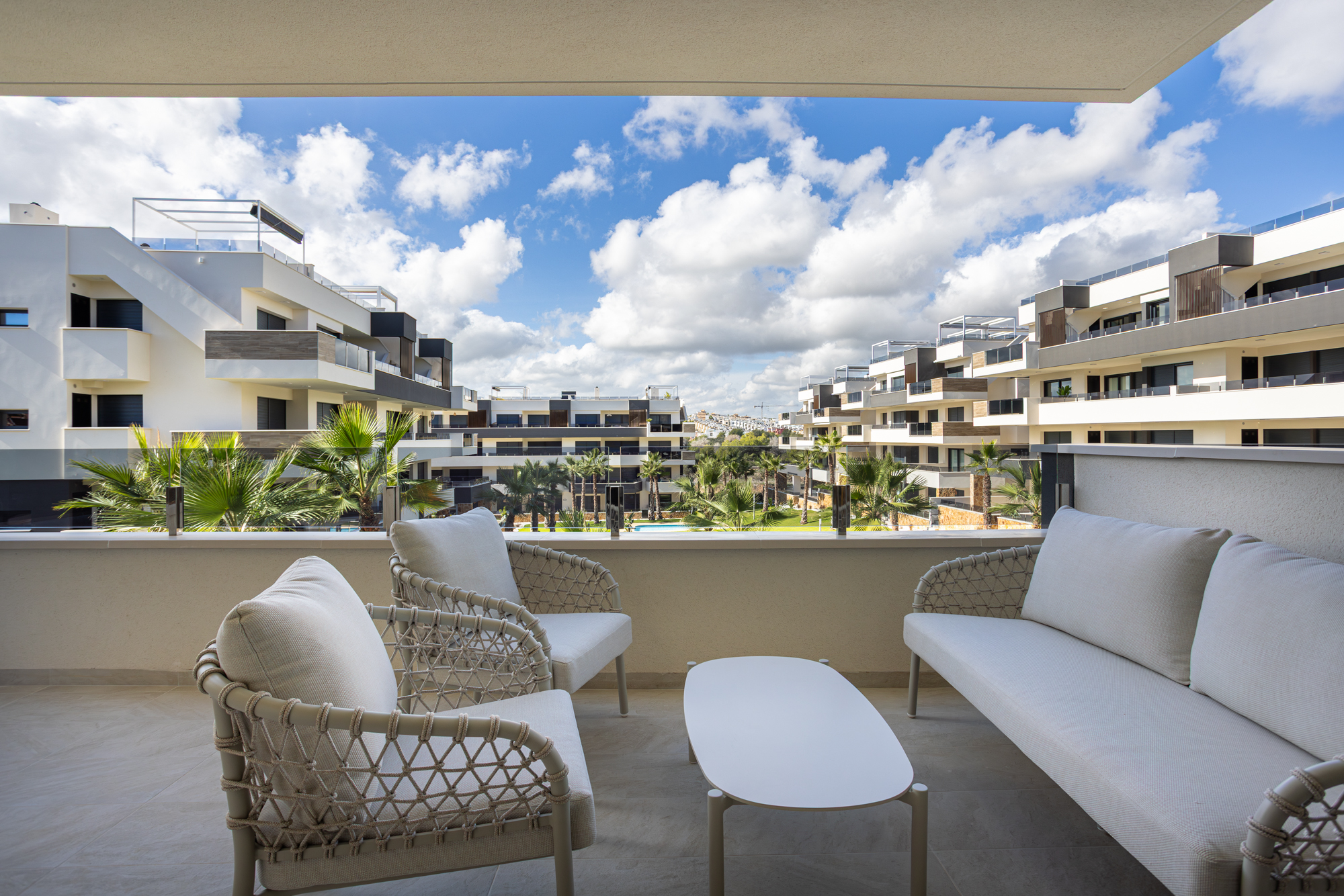 The kitchen is fully equipped with modern appliances including a dishwasher and washing machine. Air conditioning runs throughout. The complex features a shared pool and is well-located close to beaches, golf courses, and the Zenia Boulevard shopping centre.