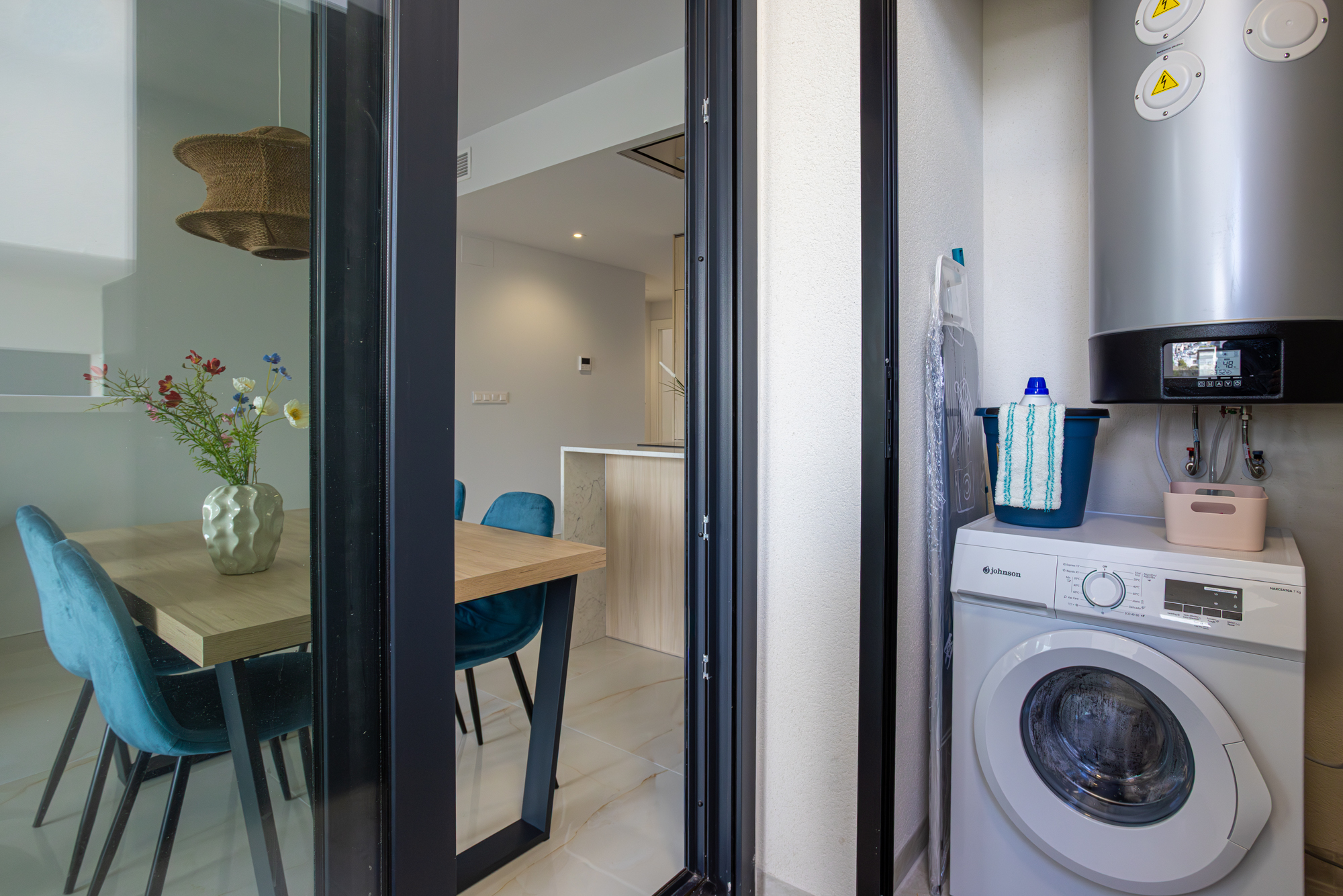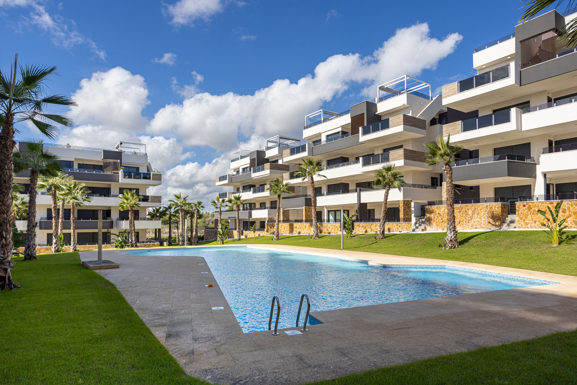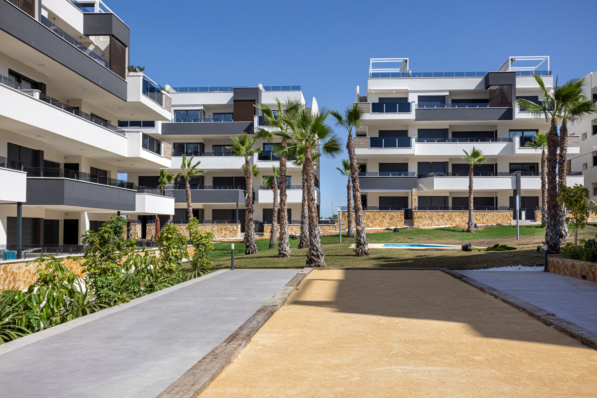 The kitchen is fully equipped with modern appliances including a dishwasher and washing machine. Air conditioning runs throughout. The complex features a shared pool and is well-located close to beaches, golf courses, and the Zenia Boulevard shopping centre.